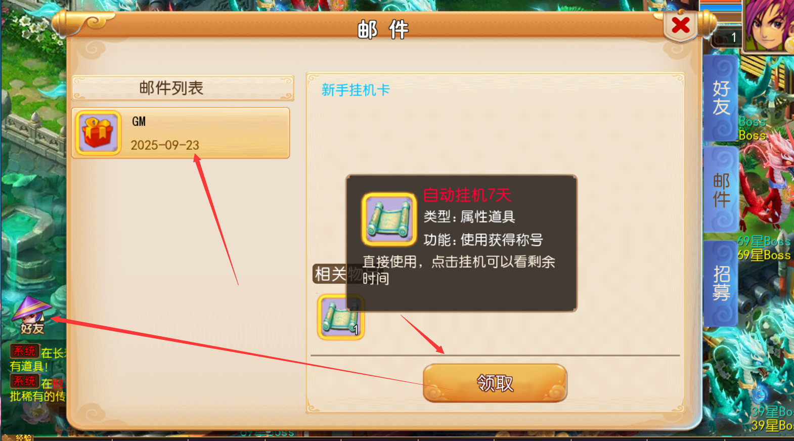- 上线点击好友,领取福利,七日挂机卡。